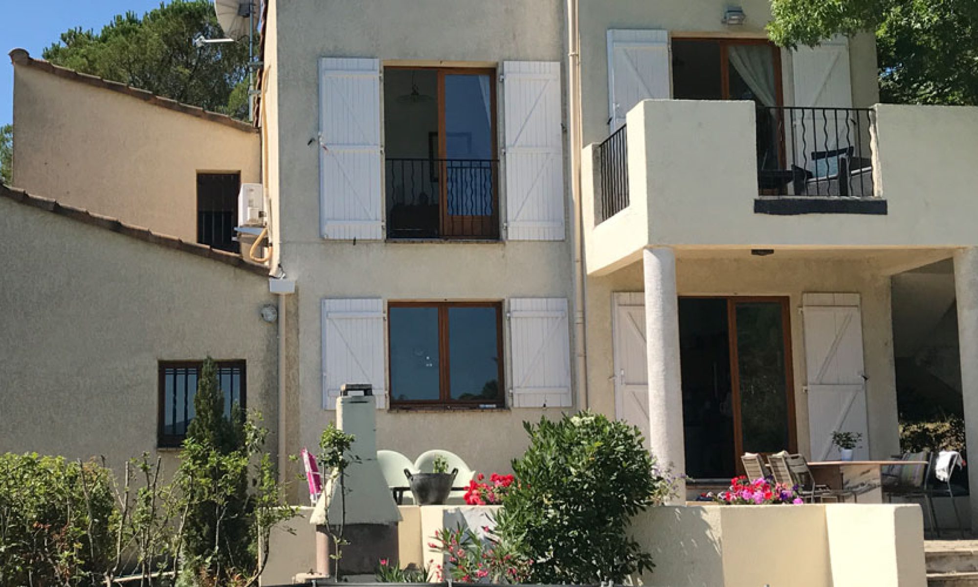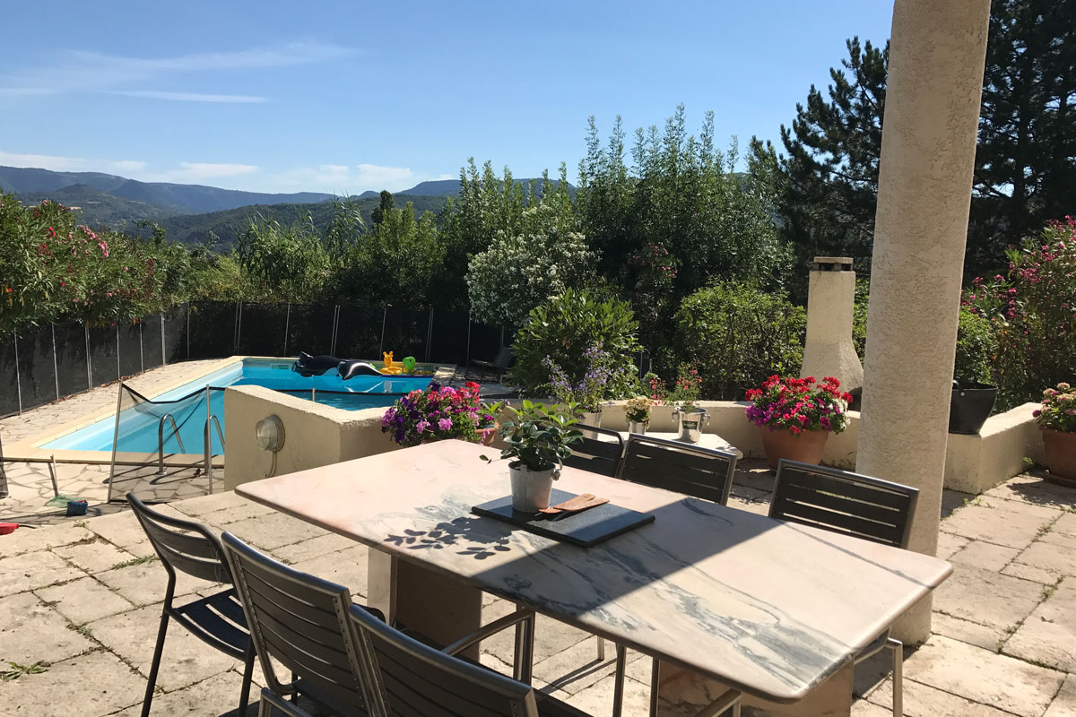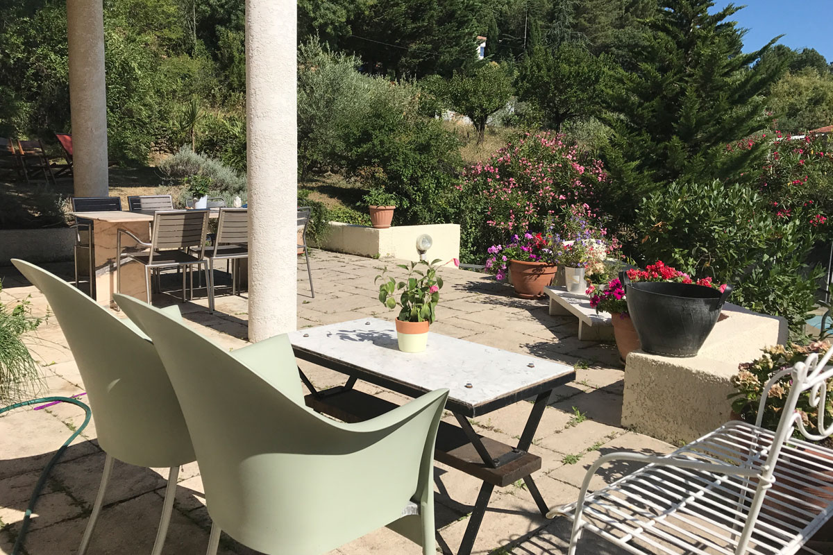 The Villa Mimosa was designed and built by its architect owner in 1997 and then extended in 2005. The Villa is set in its own grounds with a private 8m x 4m swimming pool which is perfect for relaxing and having a drink beside. The Villa has extensive terraced gardens which are part of an ancient vineyard. The owner has planted some young vines to carry on the traditions along with a few olive trees. The Villa has been designed with relaxation in mind and each of the surrounding tiled terraces offer sun, shade and quiet depending on your mood. You will also find plenty of chairs and sun loungers to help you get into the “South of France” state of mind.